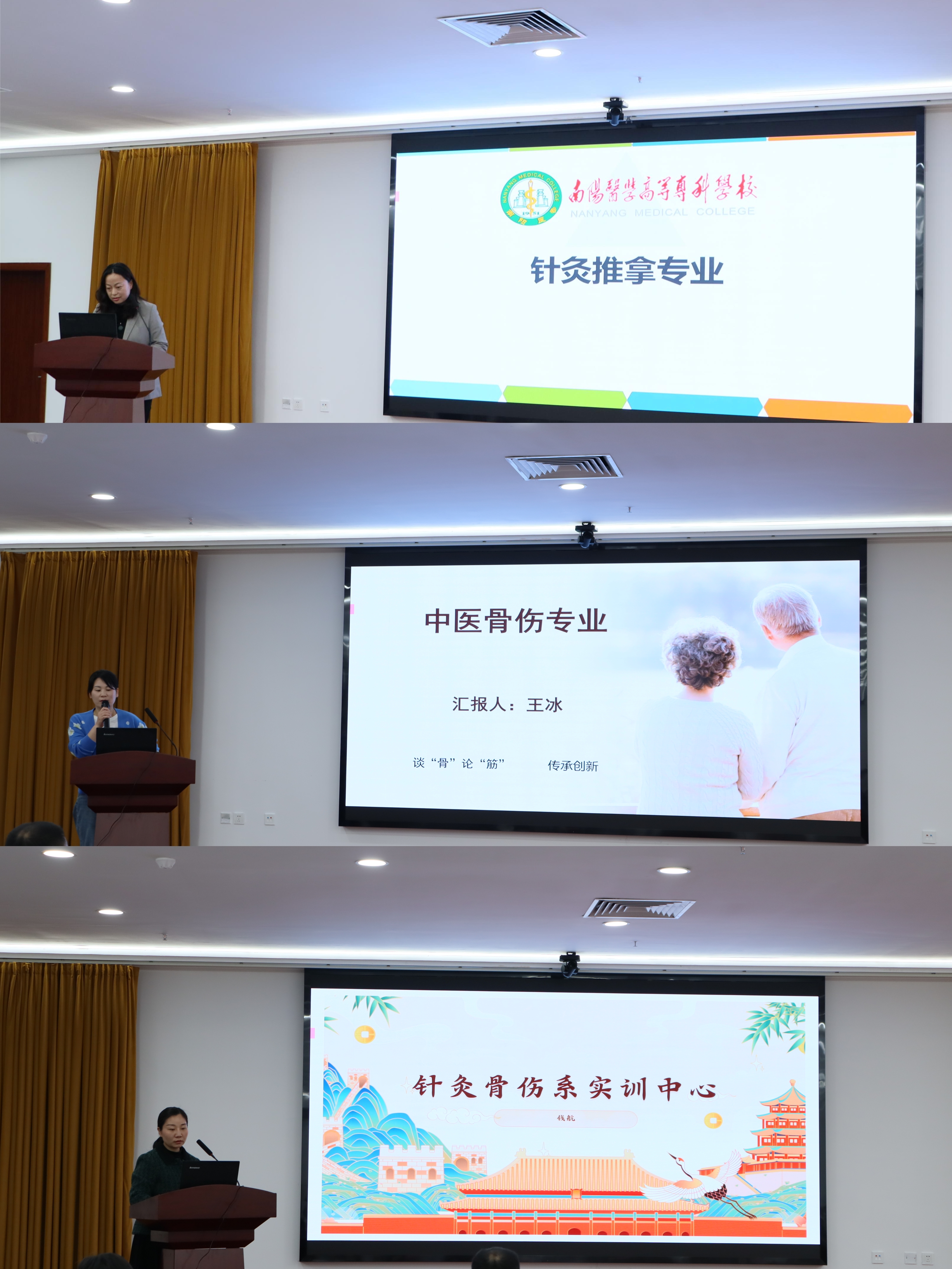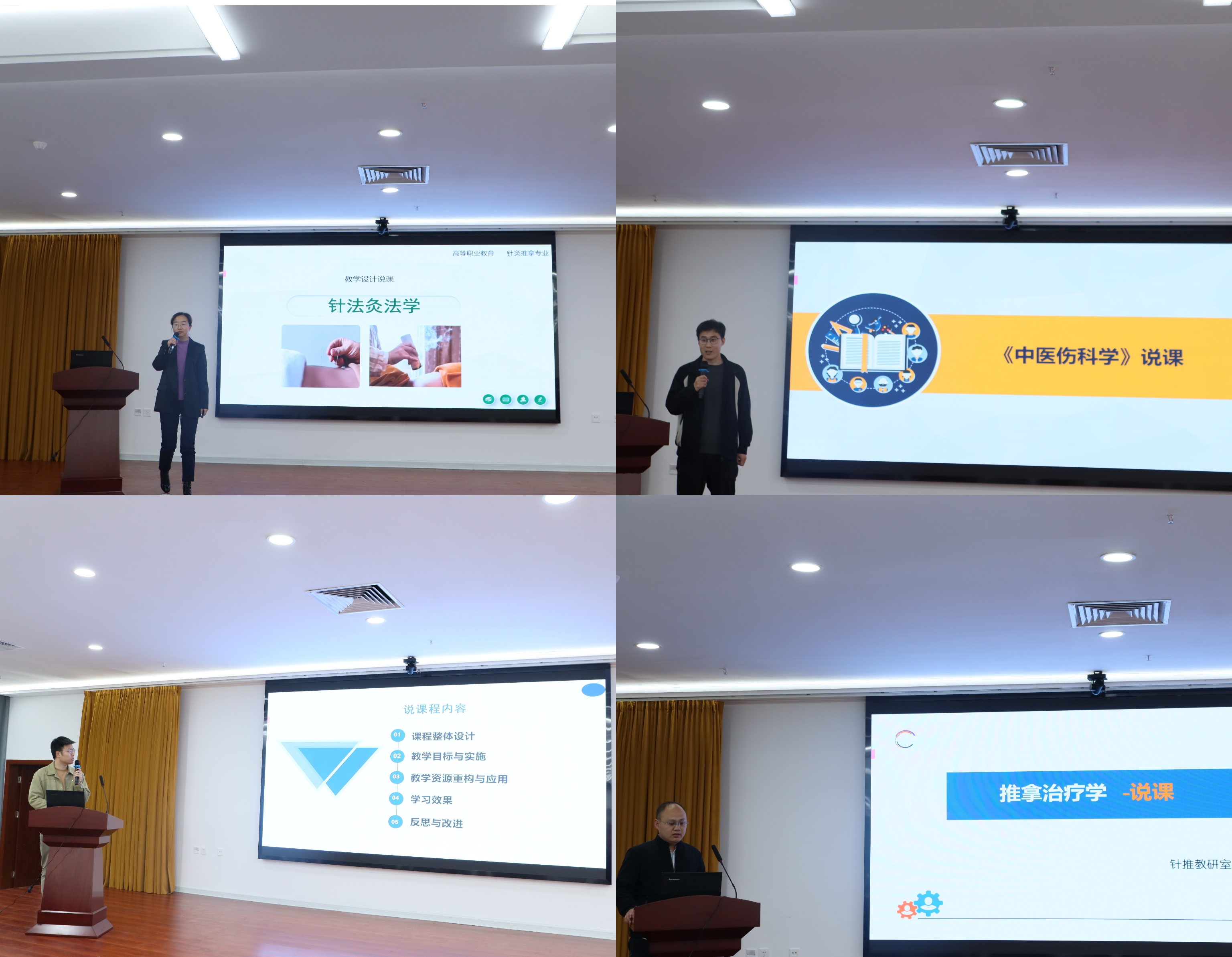 针灸推拿教研室主任刘春梅、中医骨伤教研室主任王冰、实训室主任钱航分别就针灸推拿专业、中医骨伤专业、实训平台建设情况进行了汇报。杨得光等7位专任教师分别结合专业课程进行了精彩展示。最终,杨得光老师获得了一等奖。
