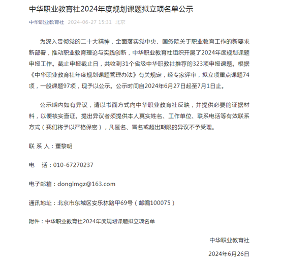 本网讯(文/教务处 刘鑫)近日,中华职业教育社发布《中华职业教育社2024年度规划课题拟立项名单公示》,我校范真教授主持申报的《围绕新质生产力发展需求,创新人才培养育“心”模式研究与实践》获批重点项目立项。