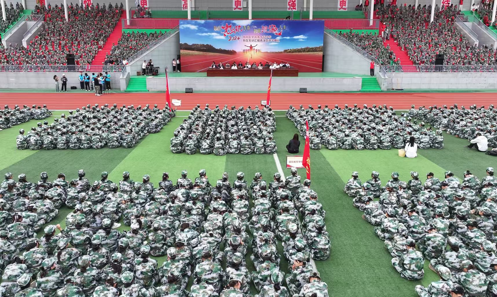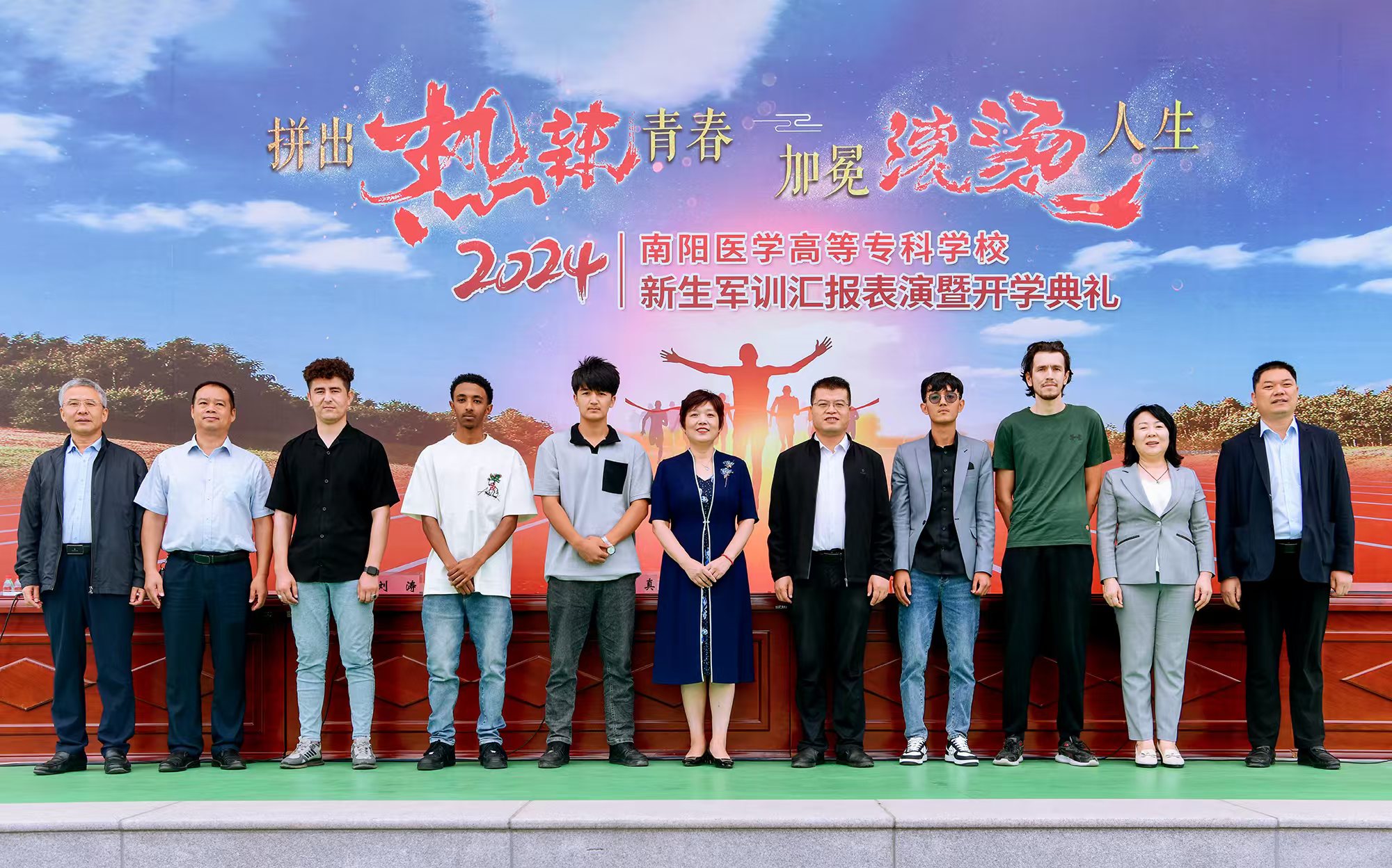 本网讯(文/党政办公室 毕大鹏)盛世金秋,惠风和畅。921日上午,南阳医专2024级新生军训汇报表演暨开学典礼在仲景西区田径运动场隆重举行。在开学典礼上,校长范真以《拼出“热辣”青春 加冕滚烫人生》为题,为2024级全体新生讲授了一堂生动的“开学第一课”。