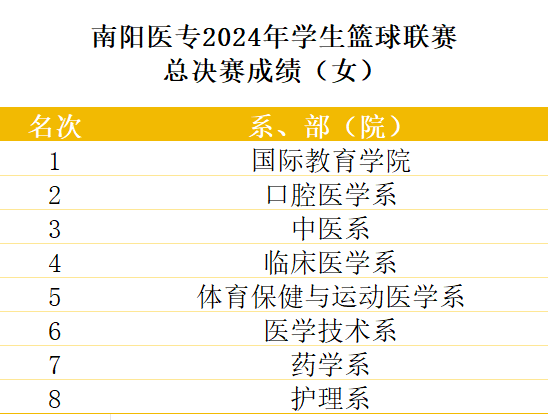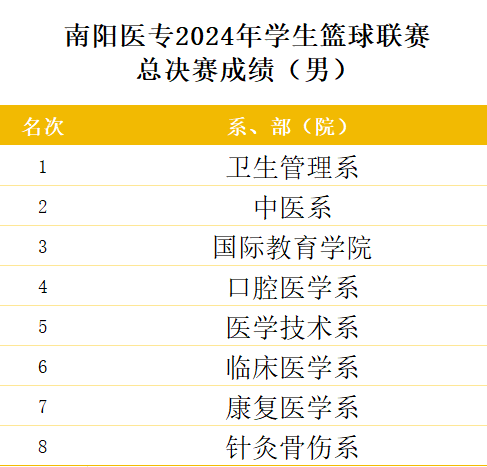 本届比赛由学校体育运动委员会办公室(体育保健与运动医学系)承办,各涉学系(部、院)协办。于1016日至111日,历经1755场激烈角逐,卫生管理系、国际教育学院分别摘得男、女子桂冠;获得男子前八名的还有:中医系、国际教育学院、口腔医学系、医学技术系、临床医学系、康复医学系、针灸骨伤系;获得女子前八名的还有:口腔医学系、中医系、临床医学系、体育保健与运动医学系、医学技术系、药学系、护理系。
