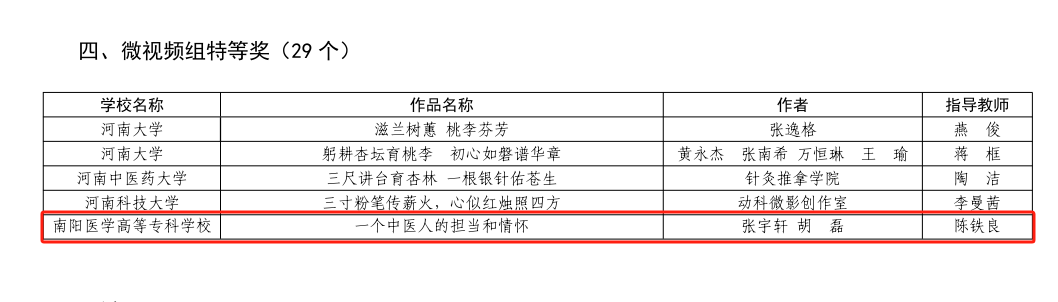 为深入学习贯彻习近平新时代中国特色社会主义思想,全面贯彻党的二十大精神,根据教育部关工委要求,省教育厅关工委2024 年在全省高校继续开展了以“教育强国,奋斗有我”为主题的“读懂中国”活动。我校关工委积极组织相关活动,下发了《南阳医专关工委开展2024年“读懂中国”活动的实施方案》,学校各二级关工委认真组织,积极参与,活动成效显著。最后由我校关工委报送的征文《医心如光,虽微至远——郭遂成》、《玉梅香满两袖清,行医济世明德显》获得征文组一等奖,微视频《一个中医人的担当和情怀》获得微视频组特等奖。我校关工委将倍加珍惜荣誉,再接再厉,争取更好成绩。(编审 李峰松)